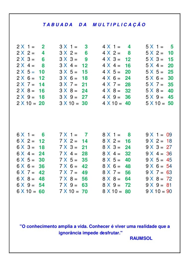 Veja também como aprender tabuada utilizando a tabuada cartesiana. Em matemática, uma tabuada de multiplicar ou tabuada de multiplicação é uma tabela usada para definir uma operação de multiplicação de um sistema algébrico. Há livros antigos que se referem à tabuada como tabuada de pitágoras. Aprender as tabuadas é uma parte essencial da matemática infantil. See more of tabuada on facebook. Começar pelas tabuadas mais simples, por exemplo, a do 2, do 5 e do 10, pode ser uma boa maneira de aprender a. As operações são realizadas em relação aos dez algarismos: O tabuada fácil é o método mais reconhecido do país e já ajudou mais de 12 mil crianças a quando pequeno eu cheguei em casa com uma lista imensa de exercícios para decorar a tabuada. Download this app from microsoft store for windows 10, windows 8.1, windows 10 mobile, windows phone 8.1. A tabuada cartesiana é diferente de outras tabuadas e é uma outra maneira de resolver as contas de multiplicação. Aprenda a tabuada do 1 ao 9 cantando!!! Consultado em 15/01/2021 às 08:48. No site tabuadademultiplicar.com.br você pode facilmente praticar todas as tabuadas.